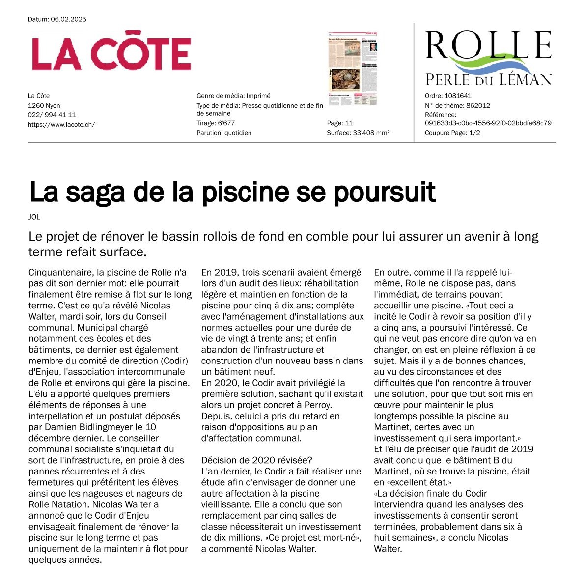 Le maintien de la piscine de Rolle est actuellement acté par EnJeu. Le comité directeur d'Enjeu avait choisi l'option d'abandonner la piscine de Rolle au profit d'une nouvelle installation ailleurs. Après analyse de la situation et discussions, j'ai très largement contribué à un changement de position et maintenant la rénovation et le maintien de la piscine à Rolle est l'option choisie. Un préavis sera présenté devant le conseil intercommunal d'enjeu.